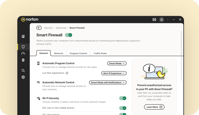 La plupart des ordinateurs sont équipés d'un pare-feu intégré, tel que le Pare-feu Windows Defender ou le Coupe-feu macOS. Le Pare-feu intelligent Norton ajoute une protection bidirectionnelle renforcée qui surveille à la fois les connexions entrantes et sortantes, bloque les applications suspectes et aide à prévenir les cybermenaces que les pare-feu intégrés peuvent manquer.